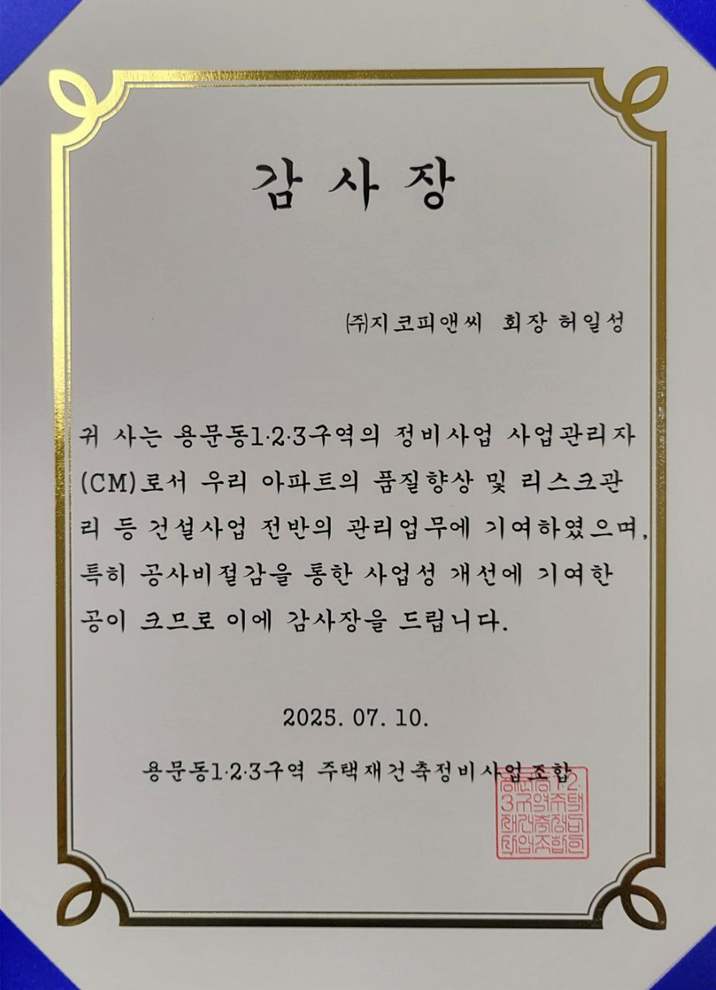 용문동1·2·3구역 주택재건축정비사업조합 감사장